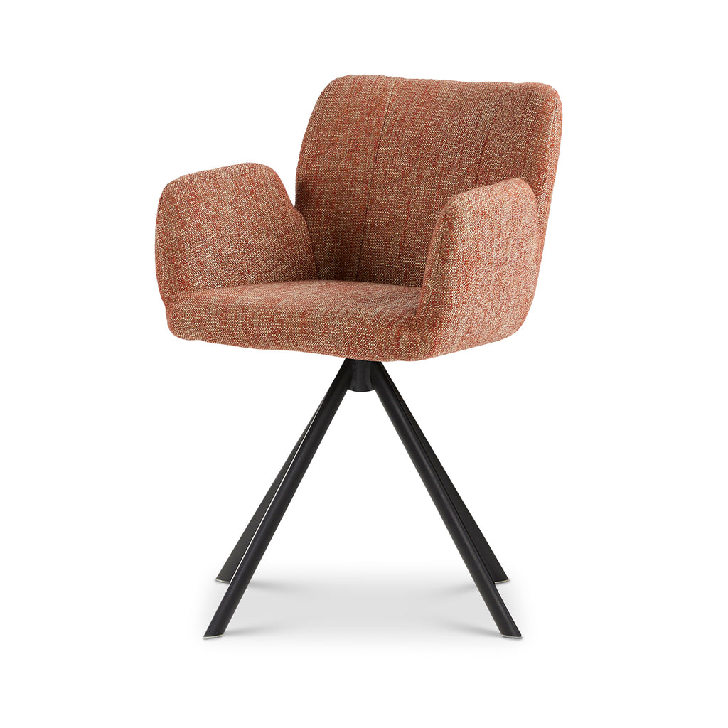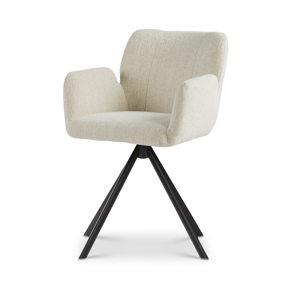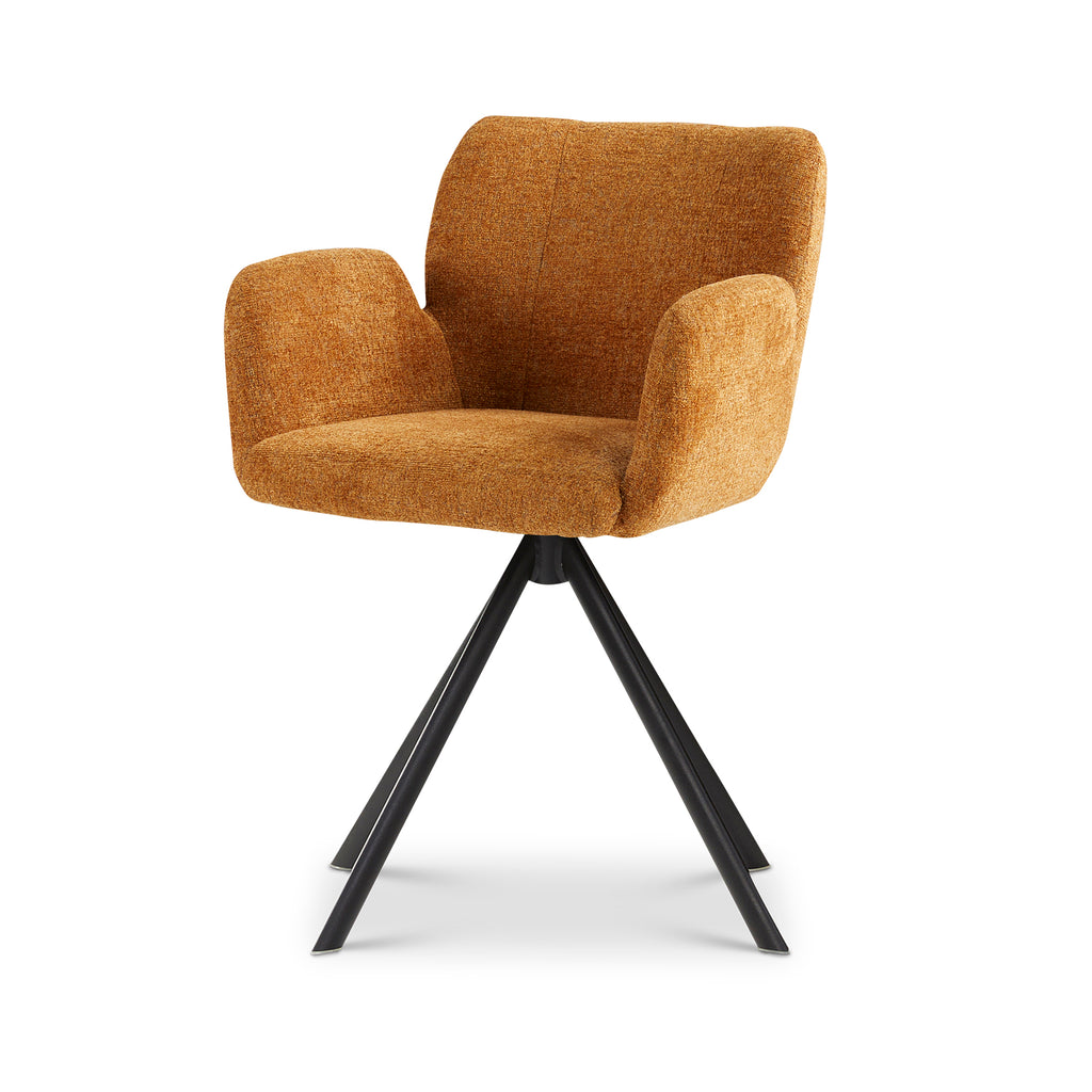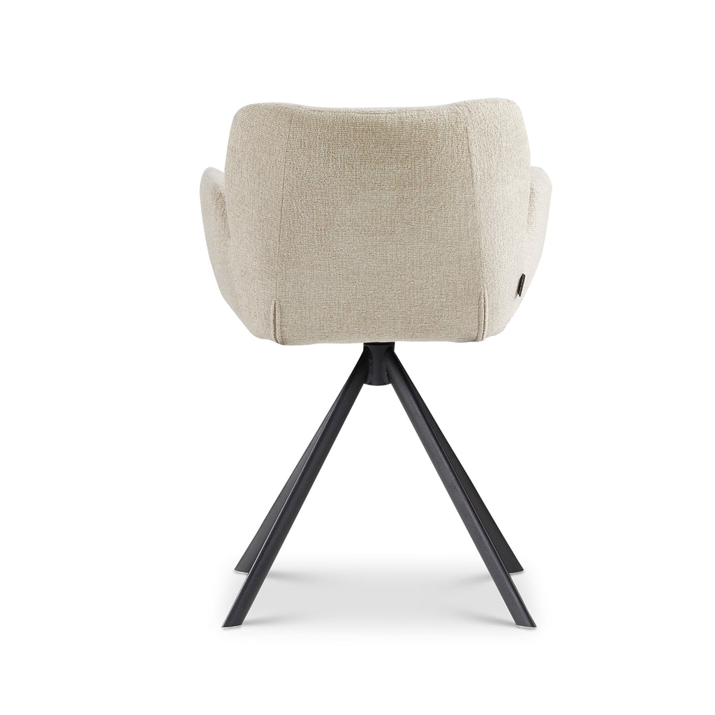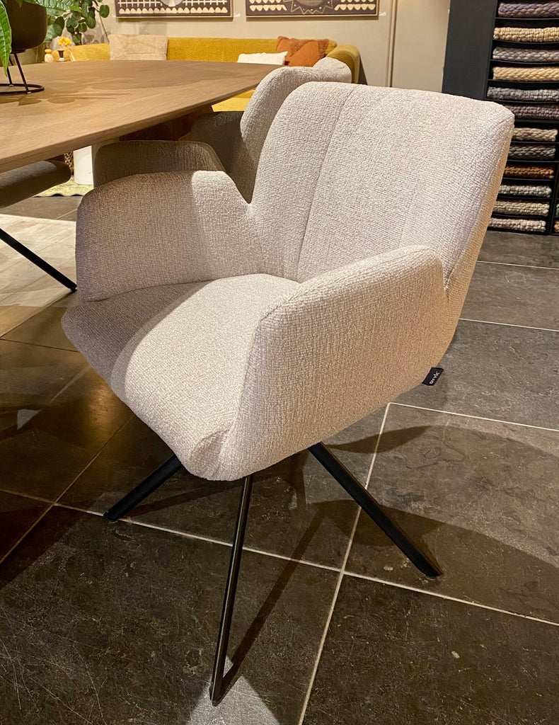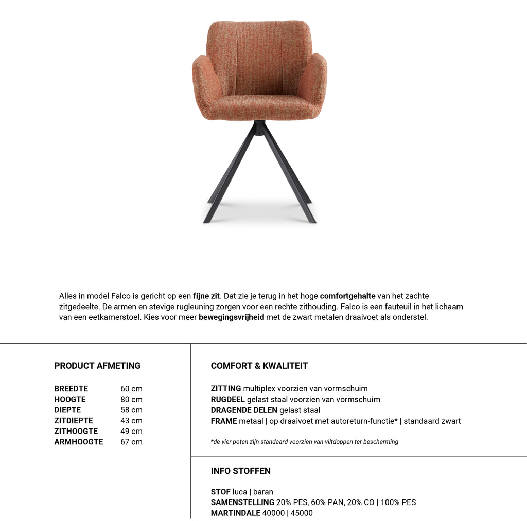 Een combinatie van een frivole uitstraling en een fijne afwerking, dat is eetkamerstoel Falco. Alles in dit model is gericht op een fijne zitervaring. Dat zie je onder meer terug in het zeer hoge comfortgehalte van het zachte zitgedeelte. De armleuningen nodigen je uit om lekker te rusten. In combinatie met de stevige rugleuning heb je zo de ideale basis voor een rechte zithouding. Stiekem is de Falco een fauteuil in het lichaam van een eetkamerstoel: hiermee mag het natafelen nog veel langer duren. De draaistoel is voorzien van auto-reverse, de stoel draait dus altijd terug naar de originele stand.