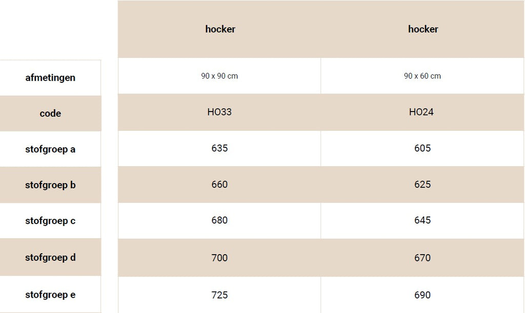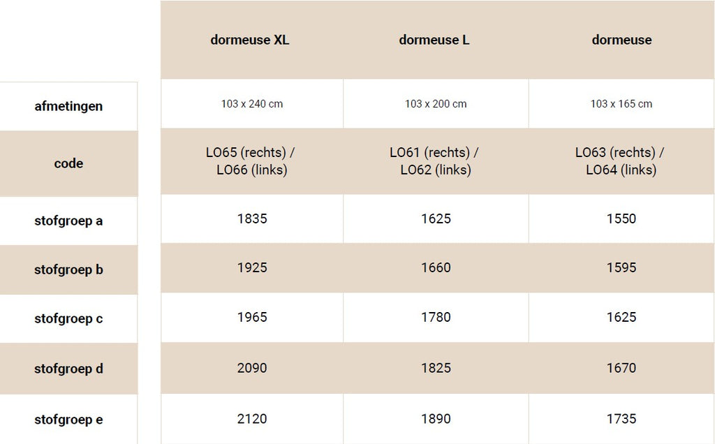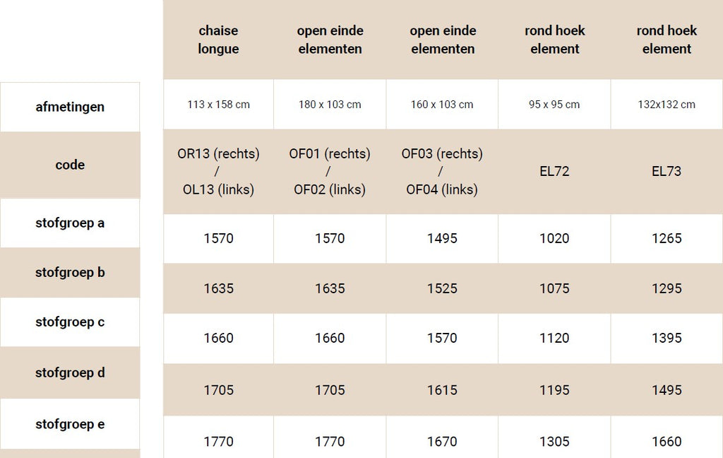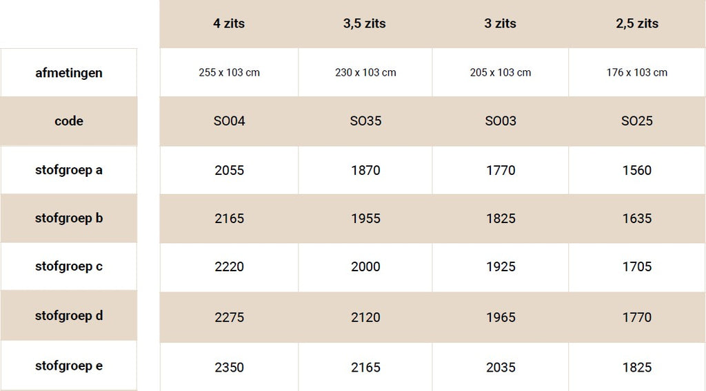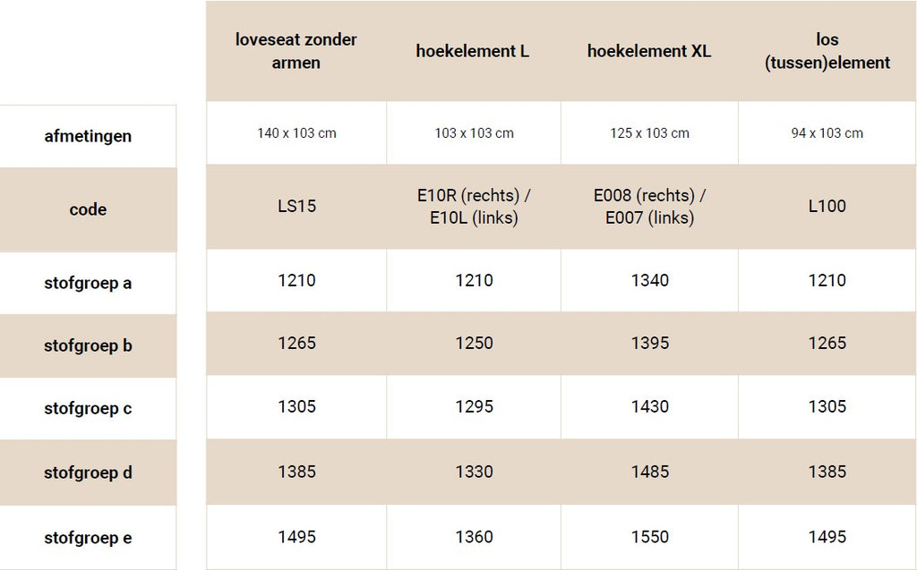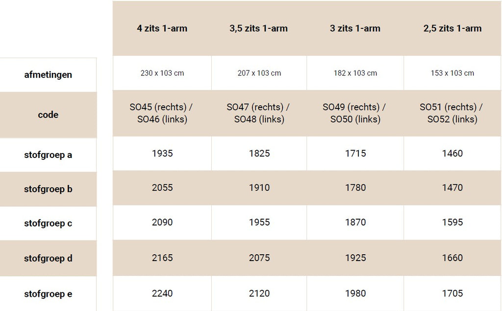 De genoemde prijs is voor de bank zoals afgebeeld op de eerste foto. De prijs van de bank kan verschillen aan de hand van de uitvoering en de maat, zie alle prijzen in de prijslijst (laatste afbeelding).
