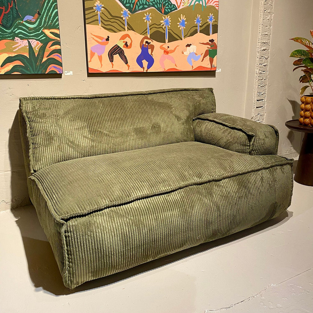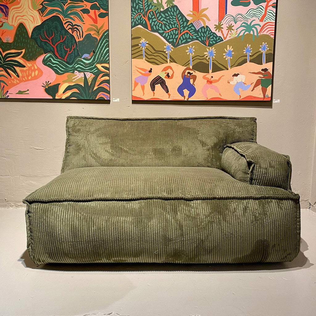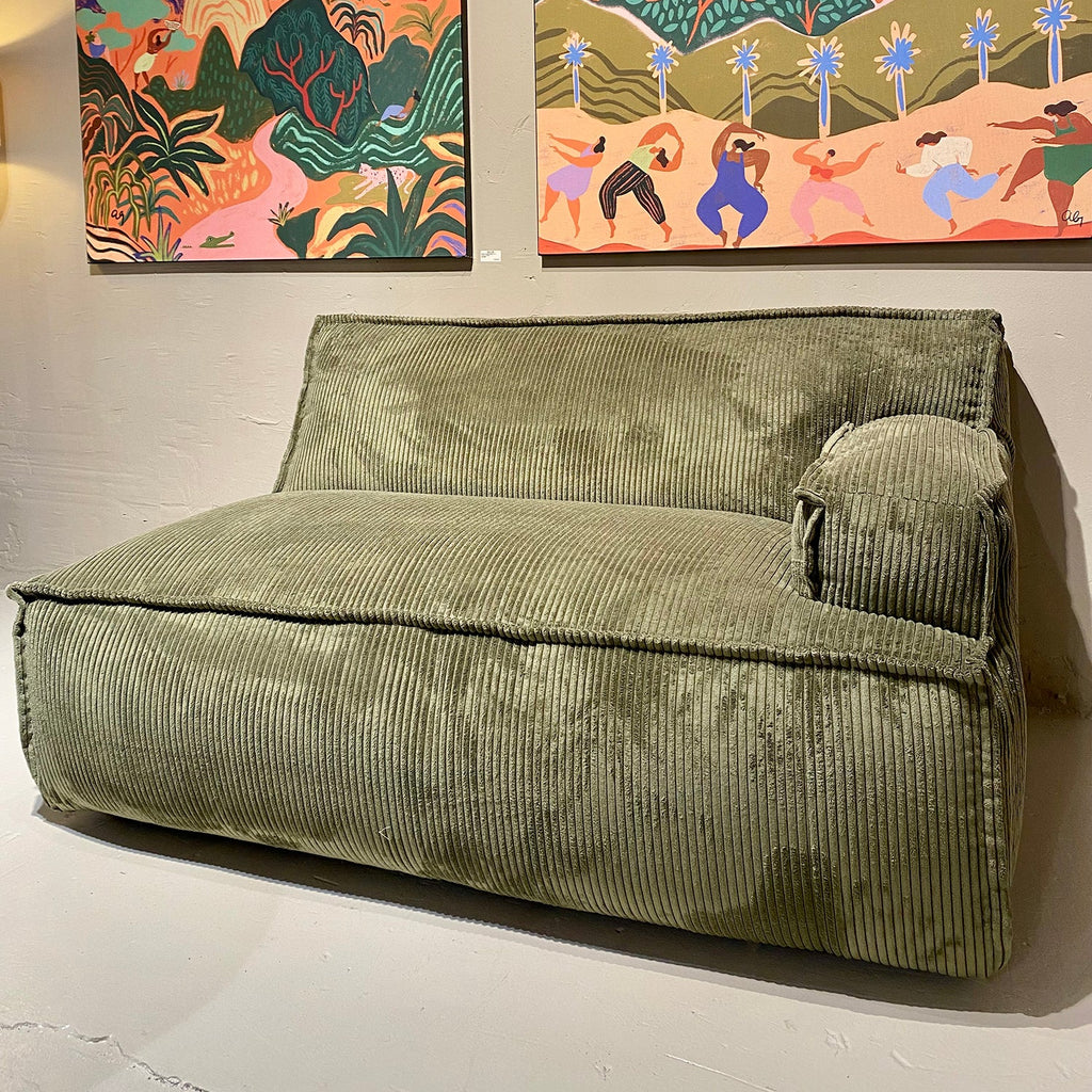 Dit nieuwe 1,5 zits element (arm rechts) is 145 cm breed en 110 cm diep en is gestoffeerd in een stevige, vlek werende ribstof in de kleur groen.