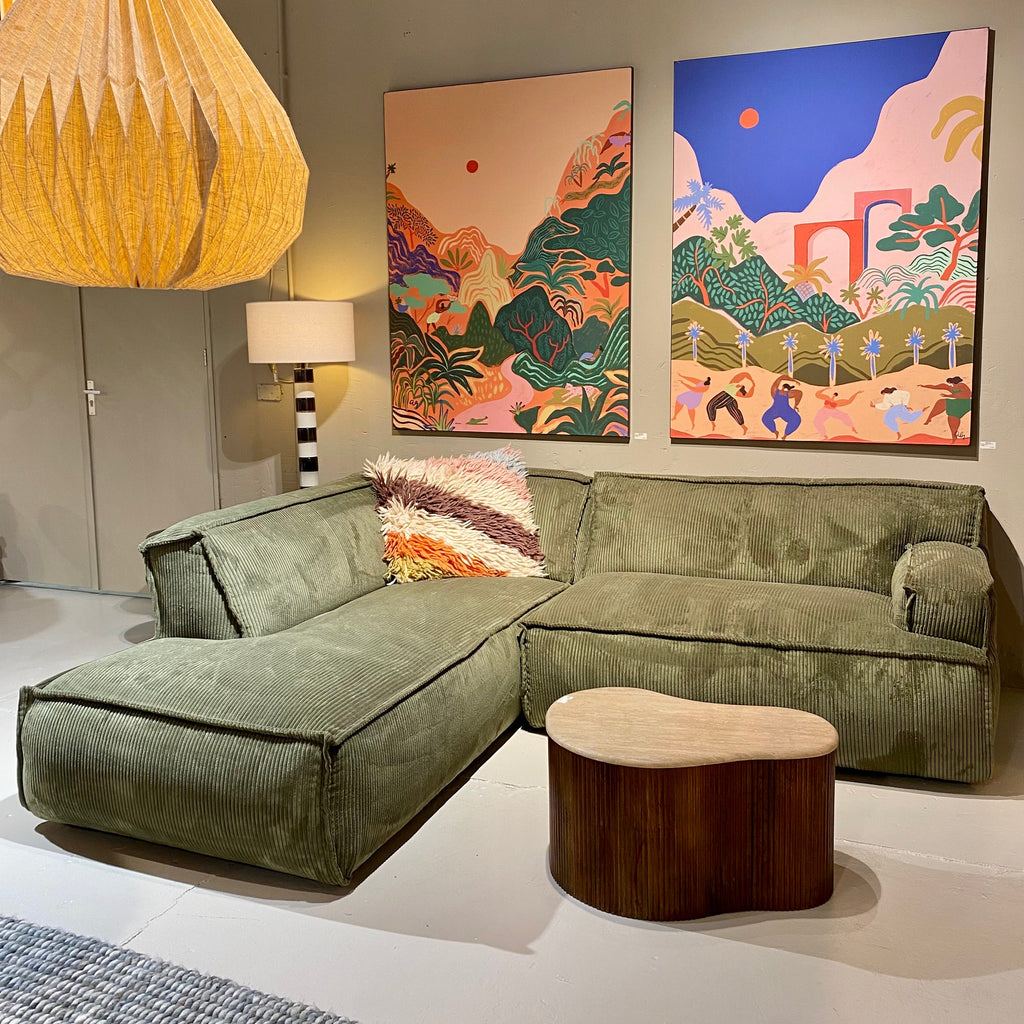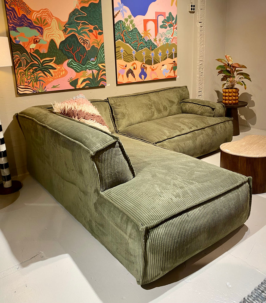 Dit showmodel bestaat uit een divan (arm links) en een 1,5 zits (arm rechts) en is gestoffeerd in een stevige en vlek werende ribstof in de kleur groen.