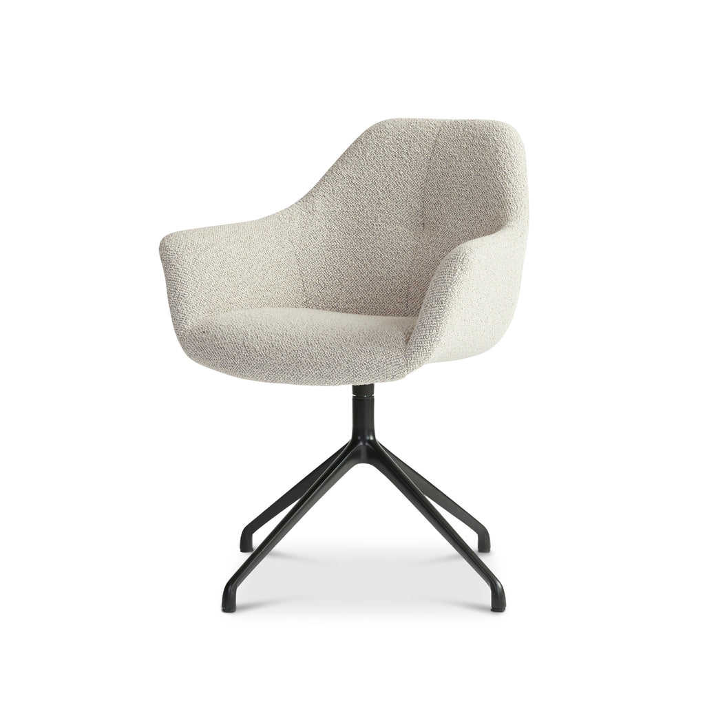 Eetkamerstoel Ids is een eigentijdse eetkamerstoel met een frisse uitstraling. De aluminium draaivoet maakt deze stoel beweeglijk en dynamisch. Dat vormt een mooi contrast met de strakke lijnen van de zitting en het ruggedeelte. De stoel is bekleed met een mooie stevige stof in de kleur nude.