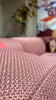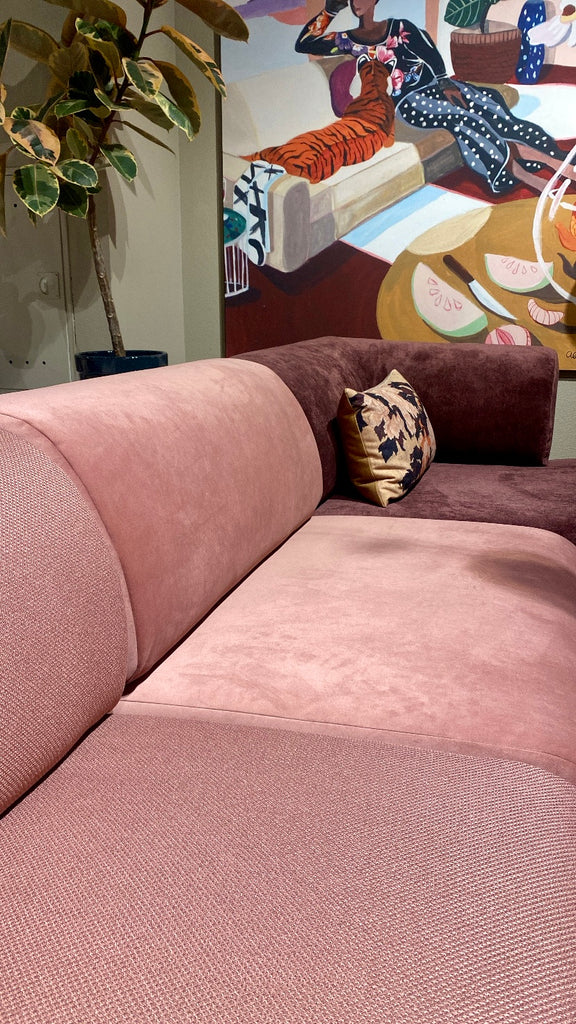 Wij verkopen ons showmodel Juul. De bank bestaat uit 3 elementen, namelijk: een hoekelement rond links, een element zonder armen 100 cm en nog een longchair rechts. Wij hebben drie verschillende stoffen gekozen die goed bij elkaar passen.