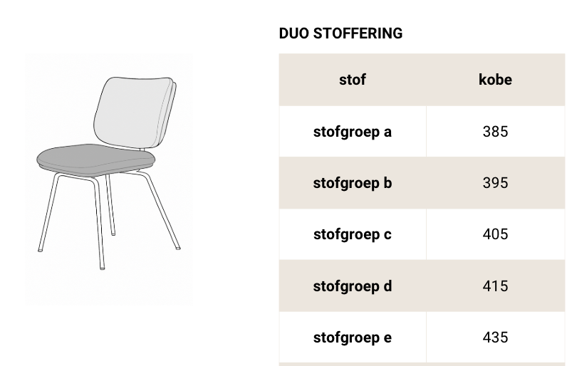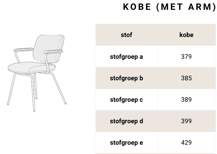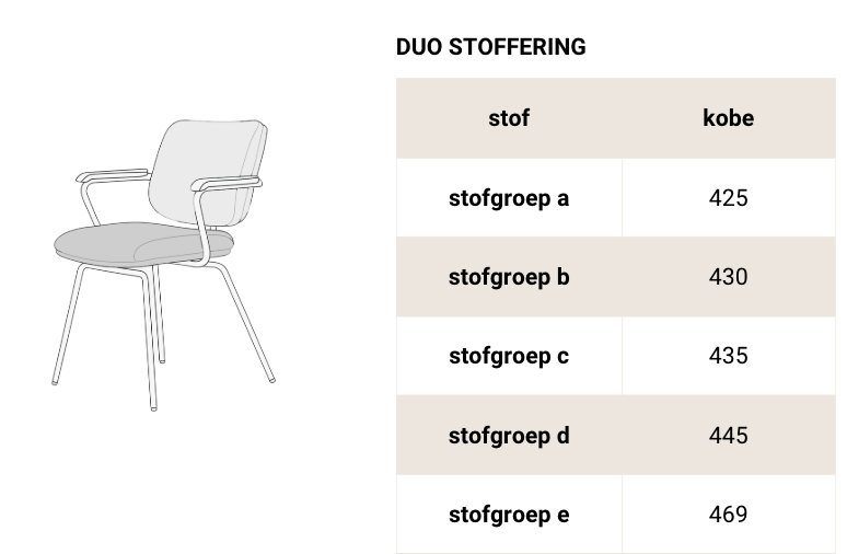 De genoemde prijs is van de stoel zoals afgebeeld op de derde foto, zonder arm en in stofgroep E. De prijs van de stoel kan verschillen aan de hand van de stofkeuze.
